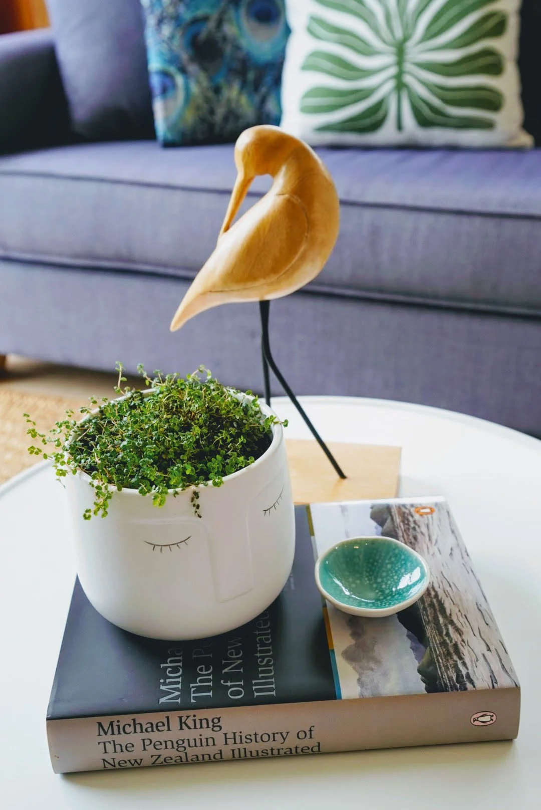 A decorative scene on a white table featuring a potted plant with a face design, a small green bowl, a large book titled 'The Penguin History of New Zealand' by Michael King, and a wooden bird sculpture standing in the plant. In the background, there is a purple sofa with patterned cushions.